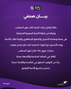 أصدرت رابطة الأندية منذ قليل بيان بشأن تغيير المواعيد في جدول مباريات الدوري المصري الممتاز وذلك نظراً لارتفاع درجات الحرارة لتكون المباريات في هذا التوقيت الساعة السادسة والتاسعة بدلاً من الخامسة والثامنة.