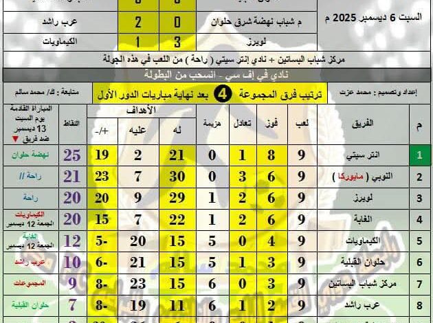 وفي مباريات السبت، فازت هيئة الشبان العالمية على كهرباء جنوب (4–1)، وسقط شبرا أمام التربية والتعليم (4–0)، بينما خطف بترو سبورت فوزًا مهمًا أمام إيرو سبورت (1–0).