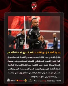 أعلن النادي الأهلي اليوم الثلاثاء عن انتقال نجمه محمد مجدي “أفشة” إلى صفوف الاتحاد السكندري على سبيل الإعارة حتى نهاية موسم 2025–2026، في خطوة تهدف لإتاحة فرصة أكبر للاعب للمشاركة بانتظام بعد قلة ظهوره الأساسي مع الفريق الأحمر مؤخرًا.