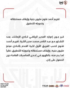 قررت إدارة نادي الزمالك توقيع غرامة مالية كبيرة على لاعب الفريق الأول لكرة القدم أحمد فتوح بعد واقعة أثارت حالة من الجدل داخل القلعة البيضاء وأثارت استياء الجهاز الفني والإداري حيث جاء القرار بتوقيع غرامة قدرها مليون جنيه على اللاعب وإيقاف كافة مستحقاته المالية بالإضافة إلى تحويله للتحقيق بعد ما بدر منه من تصرف غير مسؤول تمثل في خروجه من معسكر الفريق وظهوره في إحدى المناسبات العامة دون الحصول على إذن مسبق.